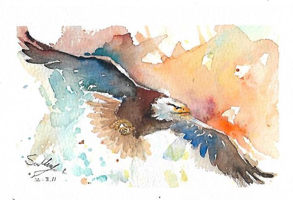 展現了老鷹在空中展翅飛翔的瞬間,背景色彩斑斕,充滿動感與力量感。藝術家透過水彩技法將老鷹的羽毛細節、翅膀的動態,以及光影在羽毛上的變化精確地表現出來,讓人感受到這隻猛禽的力量與自由。這幅插畫展示了寫實技法如何捕捉動物的動作瞬間,尤其是在描繪動物的飛行姿態時,將動感與力量完美結合,令人嘆為觀止。