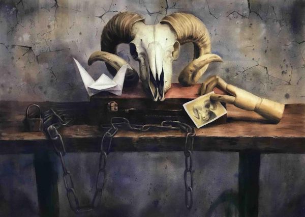是一幅充滿神秘感的靜物插畫,作品中包括羊頭骨、紙船和木製假手,這些看似不相關的元素組合在一起,卻營造出一種奇妙而有力的氛圍。藝術家透過光影的精妙運用,讓每個元素的質感被清晰地呈現出來。羊頭骨的質感硬朗而粗糙,紙船則顯得輕盈柔和,木製假手的細膩筆觸表現出工匠精神的細節。這幅作品展示了寫實插畫的力量,不僅在於對物體真實性的呈現,更在於如何透過物體之間的對比,創造出耐人尋味的視覺效果與故事感。