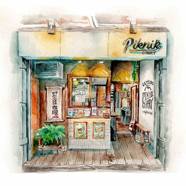 描繪了一家日式風格的小咖哩店外觀,充滿了濃厚的生活氣息。水彩的清新色彩與溫暖的光影讓這幅作品充滿了生活的溫度。店面的細節,如招牌、玻璃窗上的反光、店外的綠植,這些細膩的處理讓觀者彷彿置身於這個角落,感受到日常的美好。這幅作品展示了寫實插畫在表現生活場景中的能力,特別是在商業用途上,可以幫助品牌建立更加接地氣的形象,拉近與顧客之間的距離。