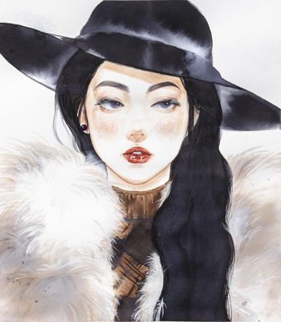 是一幅描繪戴著帽子的女性水彩畫,作品中人物的神態與姿態都透露出一種優雅與時尚的氛圍。藝術家巧妙地使用水彩技法,表現出毛皮的柔軟質感以及皮膚上的微妙光影。人物的眼神顯得溫柔且深邃,讓觀者不禁猜想她的內心世界。這幅插畫展示了寫實技法在肖像畫中的應用,使觀者能感受到人物的情感與故事。這種真實感讓作品更具吸引力,尤其在時尚領域,能夠呈現出產品與品牌的風格與品味。