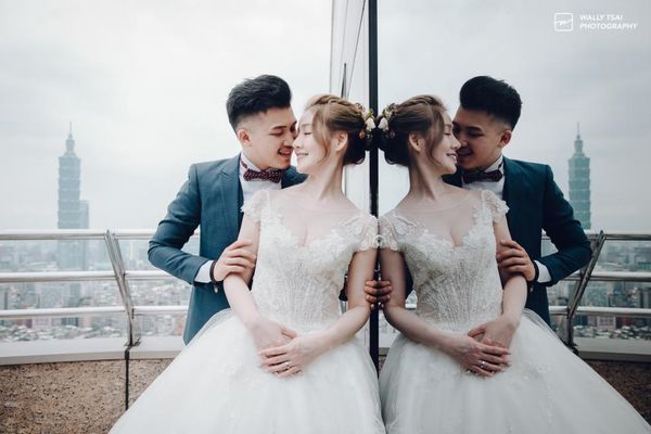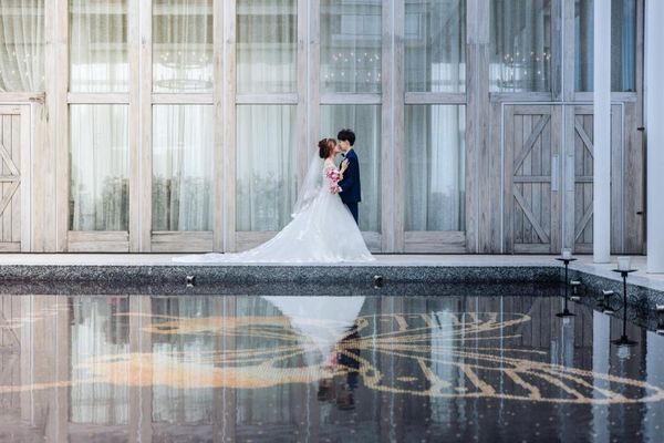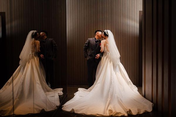好的構圖可以增強照片的深度與藝術感,在拍攝類婚紗時,可以通過使用前景、背景以及場景中的物品來提升畫面的層次感,舉例來說:使用鏡面、窗戶...等環境元素可以讓畫面更加豐富;前景物品,如:花卉、樹葉、窗簾...等,可以用來營造一種天然的框架效果,增加畫面的層次感。