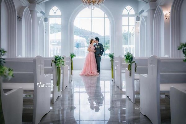▲照片展示了如何利用戶外教堂的環境來增強照片的構圖,營造出一種神聖且自然的氛圍。構圖時要注意將新人置於視覺焦點,同時將自然環境和裝飾物融入畫面,這樣能讓照片既有主題又有豐富的細節。