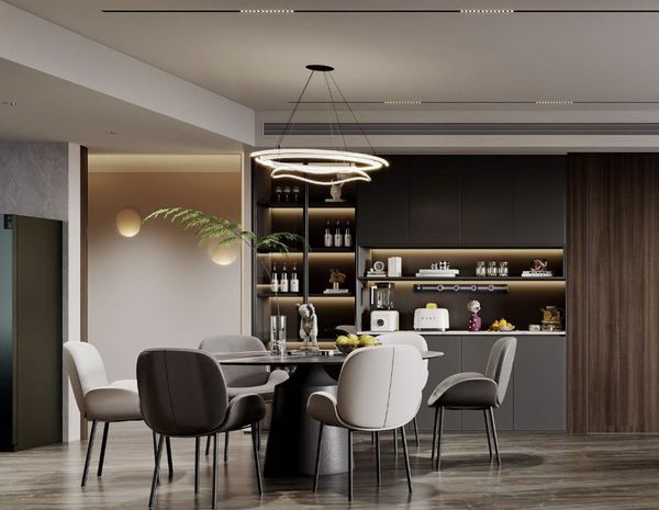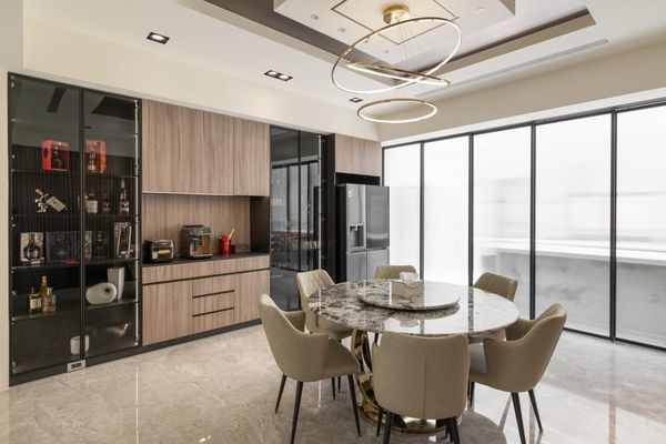 將餐廳與小型酒吧區結合起來,可以為家庭聚會增添更多的趣味性。透過一個小型酒吧區域,讓用餐與社交活動無縫結合,為家中的聚會創造出一個輕鬆而愉快的氛圍,讓客人和家人一同享受美食和飲品,營造出更加生動和有趣的聚會體驗。