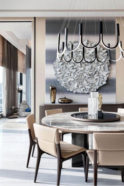 在圓桌餐廳的設計中,顏色和裝飾的選擇至關重要。透過合理的顏色搭配,可以使整個空間更加協調,增添美感。例如:牆面可以運用帶有藝術感的裝飾來點綴,增加視覺上的層次感。此外,顏色的選擇應該根據整體空間的大小和光線條件進行調整,明亮的顏色可以讓小空間顯得更加寬敞,而深色調則能增添空間的沉穩感。可以考慮在家具和牆面之間形成色彩對比,以突出重點並增強視覺吸引力。裝飾方面,選擇合適的掛畫、擺設和植物等小細節,可以讓空間顯得更加生動有趣,從而提升整體的美感和氛圍。