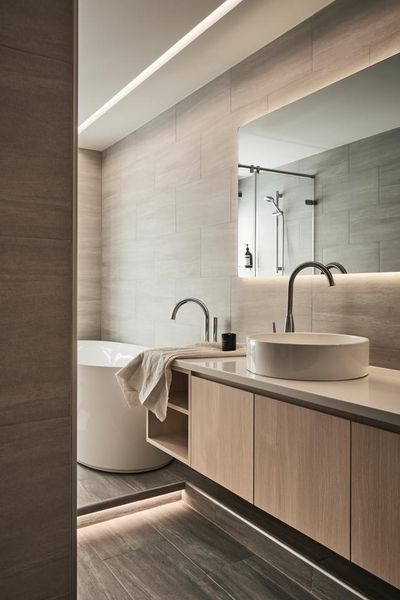 鏡子是擴大視覺空間的最佳利器,特別是在小浴室中。通過合理地安裝大面積的鏡子,可以讓空間感瞬間提升。除了安裝大鏡子之外,也可以考慮在不同角度設置多面小鏡子,這樣的設計不僅能夠增加空間感,還可以帶來更多的光線反射效果,使浴室顯得更加明亮通透。對於一些非常狹長的小浴室來說,鏡面牆是一個非常實用的選擇,能夠消除狹窄感,提升空間的視覺寬度。