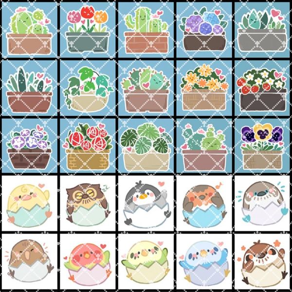 植物與小鳥貼圖系列展示各種可愛的植物和從蛋中孵出的小鳥,這些充滿愛心符號的設計給人溫馨、治癒的感覺,適合在需要舒緩情緒或想要傳達放鬆心情的對話中使用,能幫助使用者營造輕鬆愉快的交流氛圍。