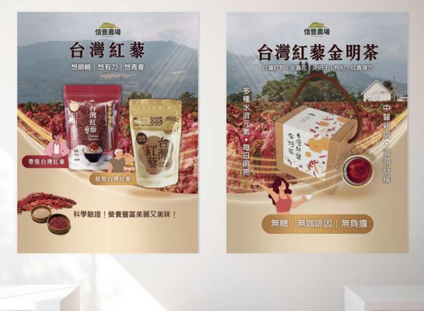 台灣紅藜和金明茶的產品傳單以台灣山區為背景,強調產品的天然與健康特點,設計風格溫暖親切,不僅突顯了產品的原產地特性,也讓消費者感受到自然與健康的生活理念。