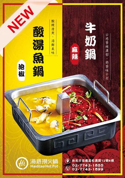 海底撈火鍋新品的宣傳單設計以鮮明的色彩對比突出酸湯魚鍋與牛奶鍋的特色,讓顧客感受到產品的獨特風味,不僅有效吸引火鍋愛好者的目光,也讓顧客產生嘗試新口味的興趣。