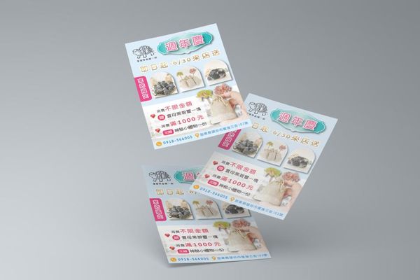 週年慶促銷的宣傳單以清新活潑的風格呈現,強調促銷優惠與贈品活動,成功地吸引顧客參與。整體設計簡潔明瞭,資訊清楚,使顧客能快速了解促銷內容,從而增加購買動機。