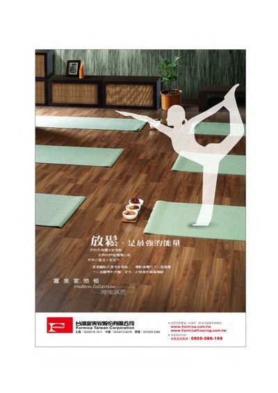 富美家地板的廣告設計營造出溫暖且自然的氛圍,瑜伽空間的設計讓人感受到放鬆與舒適,地板的質感和耐用性在設計中被完美呈現,讓消費者可以想像到產品在日常生活中的應用場景。