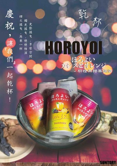HOROYOI酒飲的廣告傳單色彩絢爛,充滿節慶氣氛,讓人聯想到輕鬆的派對或聚會場合,成功地吸引年輕消費者和喜歡輕鬆氛圍的顧客,讓產品成為各種社交場合的理想選擇。
