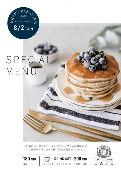 David Junior Cafe的特別菜單設計透過溫暖的配色與精緻的圖片,營造舒適的用餐氛圍。鬆餅與飲品的組合不僅看起來美味可口,還讓顧客感受到店家的用心和品質,激發前往消費的慾望。