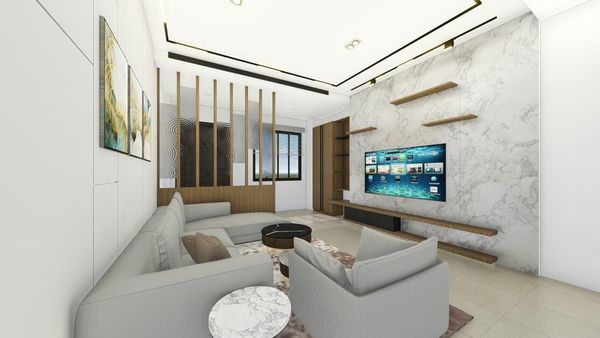 電視牆裝潢時透過暗木色層板與燈光設計的結合強化客廳電視牆的視覺層次,營造出高雅且富有層次感的客廳空間。燈光的巧妙運用使得層板的顏色和紋理更加突出,為居住空間增天立體感。這樣的設計非常適合想要提升空間質感的家庭,尤其是在現代風客廳設計中,這種搭配能帶來別具一格的視覺感受。