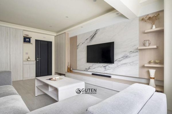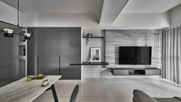 層板與石材牆面的搭配,讓電視牆充滿現代感與質感,這種設計可以為客廳帶來強烈的視覺衝擊,展現現代風格的獨特魅力。大理石電視牆的冷硬質感與木質層板的溫暖相互結合形成強烈對比,使得空間更加引人注目。