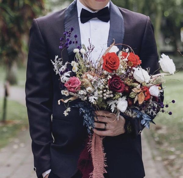 如果是復古風格的婚禮,可以選擇深色系玫瑰和乾燥花材來打造濃郁的層次感和質感。這樣的捧花設計能夠很好地配合復古婚禮的氛圍,增添典雅的感覺。復古風的婚禮捧花通常會選擇顏色較為濃烈的花材,如:酒紅色玫瑰、深紫色薰衣草...等,以體現歷史的厚重感和典雅。