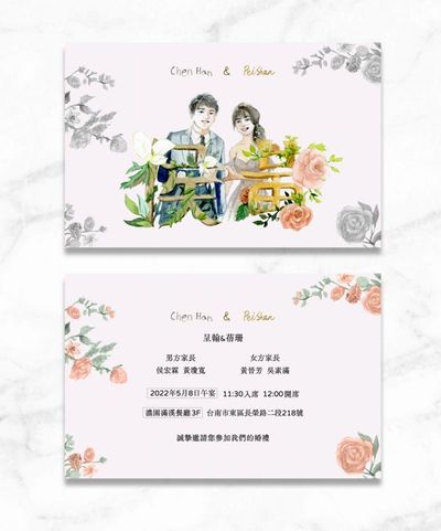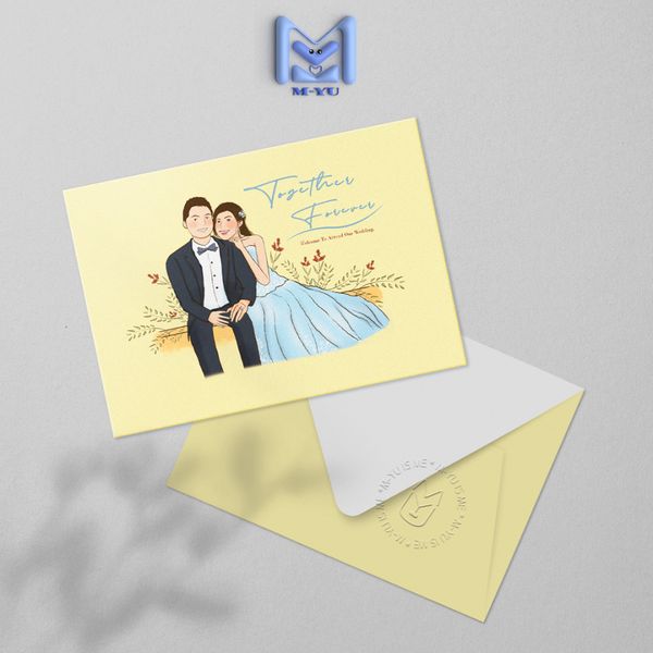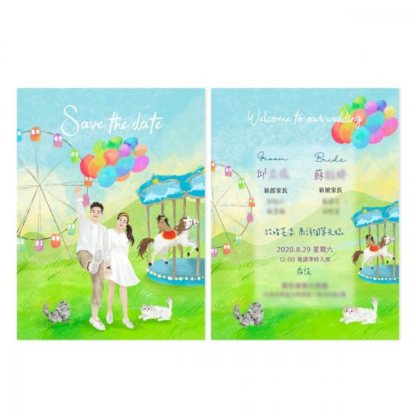 趣味插圖風格的婚禮邀請卡充滿幽默感,以生動的方式表現新人的故事,這種風格適合希望婚禮輕鬆有趣的新人。照片中的插圖風格充滿了溫馨與趣味,讓人看了忍不住微笑,這種風格的邀請卡可以包含新人共同的趣事或有趣的經歷,讓每位賓客在收到卡片時感受到新人間的甜蜜點滴,並為婚禮增添更多笑聲。