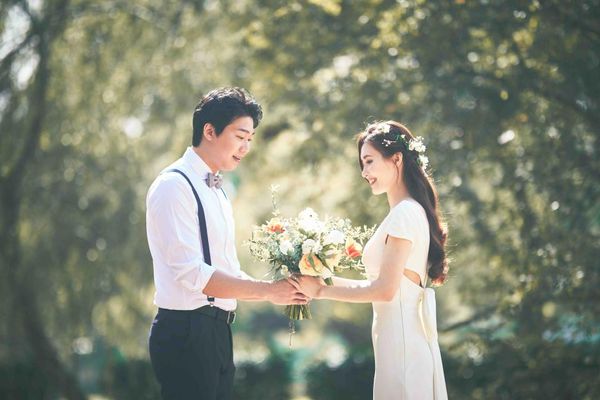 在自然光充足的樹林中拍攝,利用綠意與花朵來襯托新人的情感,強調他們之間的交流。選擇森林作為拍攝地點,可以讓整個畫面充滿自然的氣息,建議在柔和的光線下進行拍攝,強調新人的互動和情感交流。