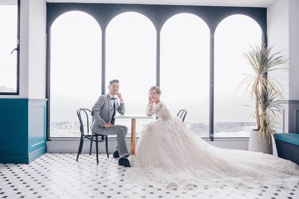 窗邊的浪漫時光是一個靜謐而充滿感情的姿勢,下圖展示了新人在窗邊對坐的場景,整個畫面充滿了靜謐而甜蜜的氣氛。
