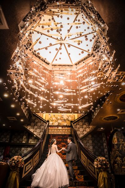 新人在樓梯上牽手,這是一個經典而高雅的婚紗姿勢,樓梯的層次感和華麗的背景元素,使得整個場景充滿了浪漫氛圍,透過樓梯的高度和燈光的營造,新人彼此牽手的畫面充滿浪漫與優雅。