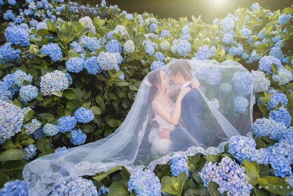 新人在繡球花叢中相擁,是婚紗攝影中常見的夢幻姿勢之一,攝影團隊將新人擁抱的場景與繡球花的美麗結合,營造出如夢似幻的拍攝風格。