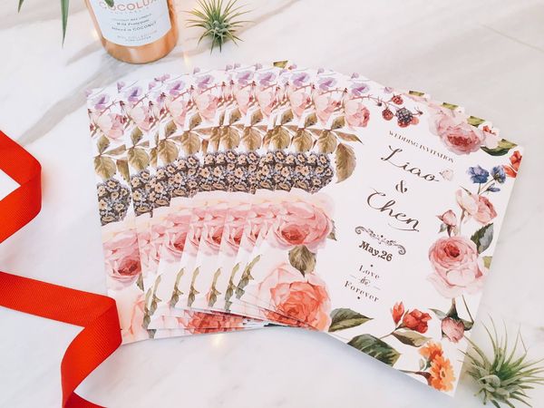 在設計婚禮邀請卡時,選擇一個統一的主色調可以使整體設計更具一致性,並且提升整體的視覺質感。下方照片中的喜帖整體採用了粉色作為基調,不僅讓整體視覺效果和諧,還能夠傳達甜美、溫馨的氛圍。