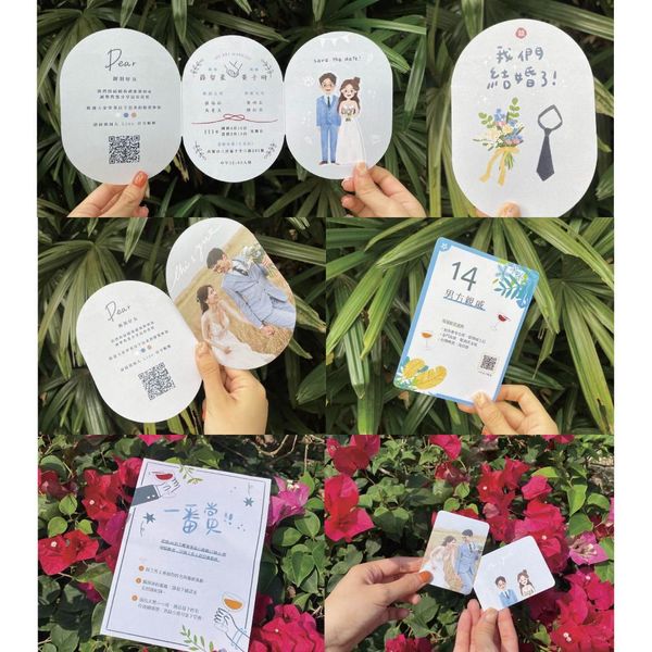 婚禮邀請卡也是展示新人性格和創意的好機會,讓雙方的名字和故事得以通過設計傳遞。照片4 採用了幽默和趣味的插畫風格,讓整體設計看起來輕鬆活潑。這樣的設計非常適合那些希望婚禮充滿笑聲與歡樂的新人們。