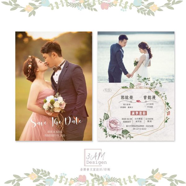 將婚紗照與花卉元素結合,是許多新人希望在婚禮邀請卡中表達個人故事的方式,這樣的設計可以展現雙方的愛情與承諾,並讓賓客感受到新人的喜悅。下圖中的喜帖範例完美地將婚紗照融入到卡片設計中,搭配花卉圖案,既浪漫又具有紀念意義,讓每一位收到邀請的賓客都能感受到新人的幸福。