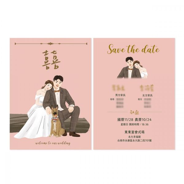 對於熱愛寵物的新人來說,邀請卡中加入寵物元素是表達愛的好方法,這樣的卡片設計可以讓賓客感受到新人之間的溫暖與幸福,下圖中的喜帖插畫以新人和心愛的寵物為主題,營造了家庭般的溫馨氛圍,展現了婚禮中的親密感,讓賓客感受到新人之間的愛和溫暖。