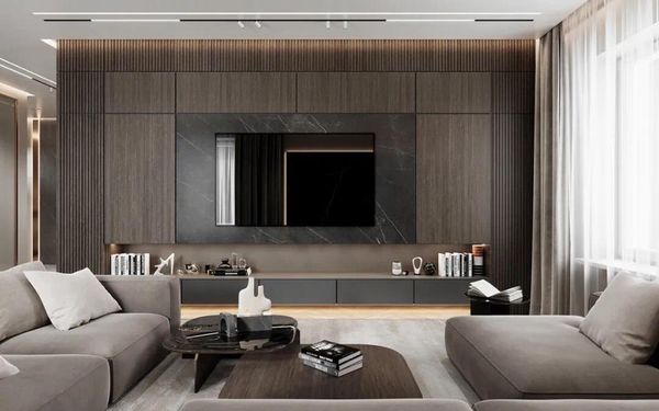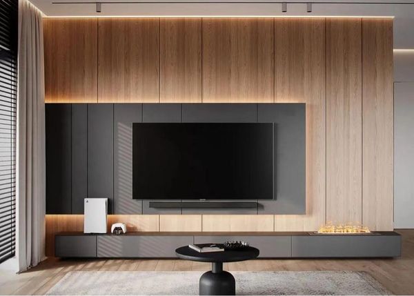 如果您喜歡沉穩而高雅的感覺,可以選擇深色木紋的電視牆,深色木紋在光線的照射下能呈現出層次豐富的視覺效果,無論是搭配深色家具還是亮色配件,都能創造出一種對比鮮明的美感,使客廳顯得更加有品味,營造出一種溫暖而不失大器的氛圍。