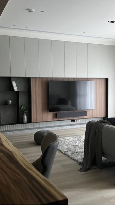 木紋電視牆可以結合書架、展示層板或系統櫃提升客廳的實用性,使電視牆不僅是一個裝飾元素,還能滿足家庭的多樣需求,讓客廳變得更具實用性和美觀性,為家庭成員提供更多的便利和舒適感。