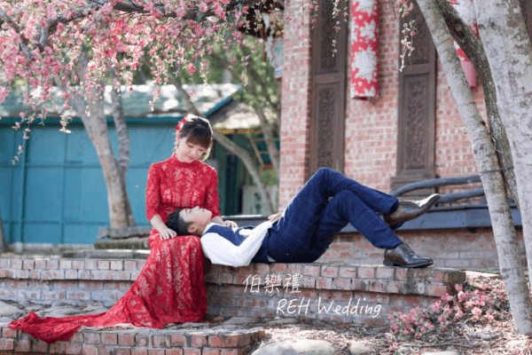中式復古婚紗通常為鮮豔的大紅色,彰顯婚禮的喜氣感,中式婚紗照的背景無論選擇紅磚瓦房、山間過道或是盛開的花卉都相當有意境,搭配復古款式的中式婚紗禮服打造彷彿古裝劇的場景。