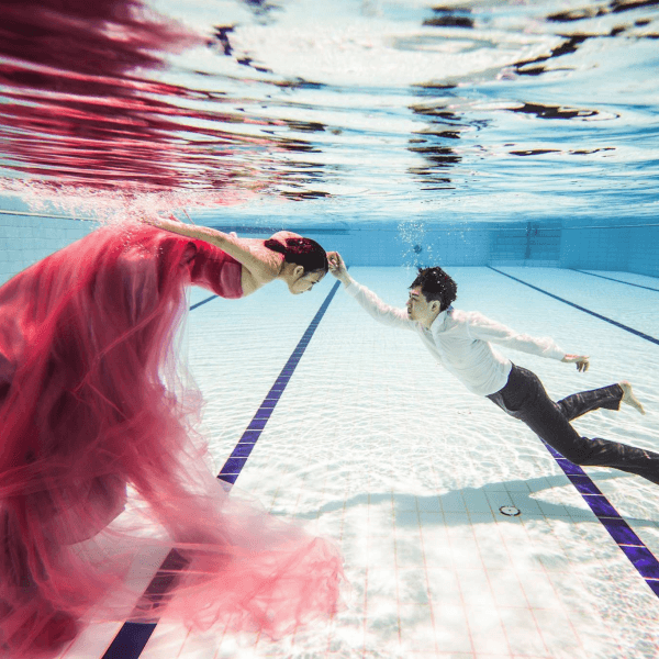 彷彿美人魚的水中婚紗華麗又充滿氣勢,飄逸的裙襬與頭紗失去重力地飄浮在身體四周,新人們牽著彼此於水中共舞,透明的氣泡折射光線,打造夢一般的奇幻場景。