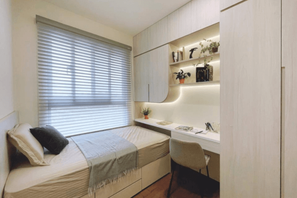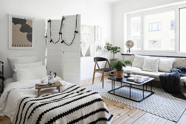 小空間應以淺色調為主,如白色、米色、淺灰...等中性色,讓空間顯得更加寬敞明亮。此外,還可以透過抱枕、床單...等軟裝加入淺黃、淡綠...等個人喜愛的招財色彩,小空間需注意避免使用過於鮮豔或深色的色彩,以免空間顯得擁擠壓抑。
