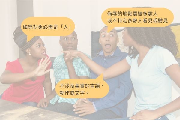 | 言論內容 | 未涉及具體事件的粗鄙言語、負面形容詞...等辱罵或冒犯行為 | 捏造特定事實,損害他人名聲或評價,例如:偷竊、外遇、詐欺、黑心店家...等 |