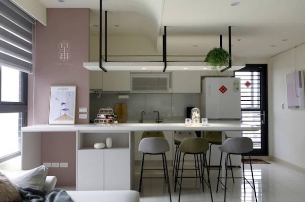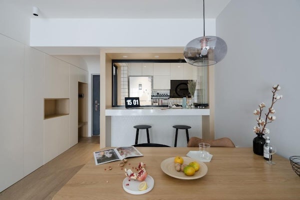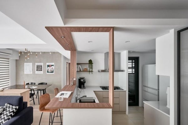 在隔間牆上開孔或開窗是半開放式廚房的常用裝潢手法,能使自然光照進廚房,延伸空間也保留廚房的獨立性,使空間更有層次。