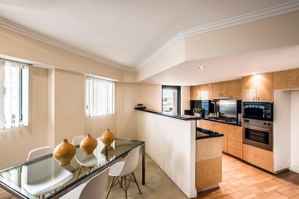 如果廚房裝潢預算有限無法拆除牆面,您可以將原來的廚房門片改成玻璃門,讓視線延伸至廚房內,提升整體單位的空間感。