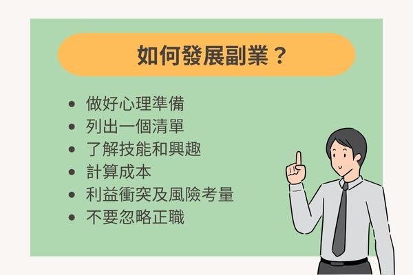 - 計算成本:副業需要長期經營及投資才有可能開花結果,建議您在開始發展副業前,先考慮經營副業時可能會用到什麼器材、裝備或資源,計算經營副業所需的成本,避免還沒賺錢就因過度花費而影響生活。