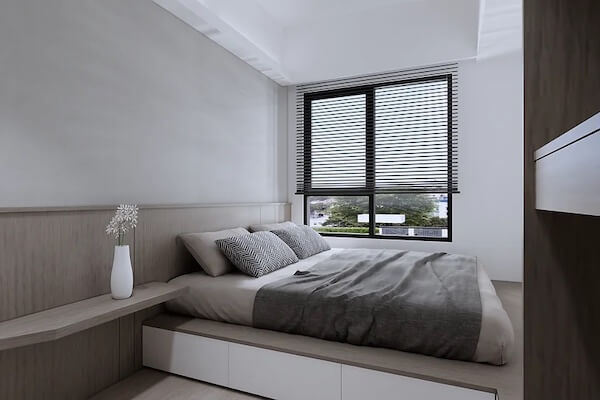 如果小臥室已經沒有多餘的空間可以擺放衣櫃,可以在進行小坪數房間設計時採用日式和室的架高地板設計,可以利用系統櫃規劃地板櫃,或是請木工師傅鋪設架高木地板,除了可作為床架使用外,地板下方還可以規劃成收納空間,放置替換的寢具與換季衣物。