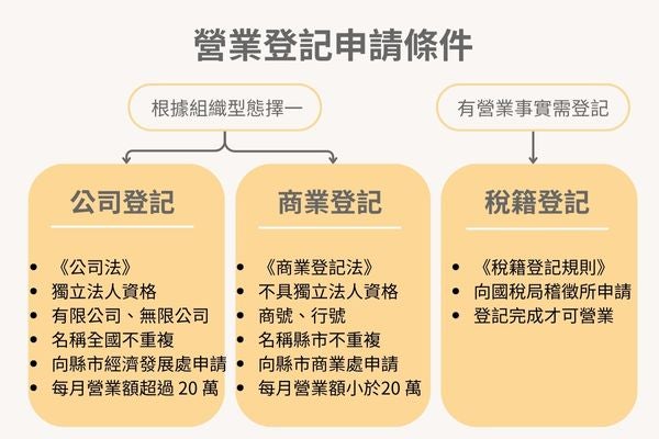 進行營業登記時,登記者需先就組織型態選擇「公司登記」或「商業登記」,並完成「稅籍登記」,才是完整的營業登記流程,以下將為您分別整理三者的申請條件: