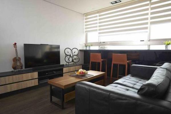 狹小的客廳空間通常會產生視覺上的壓迫感,因此可以採用開放式客廳設計,將客廳與廚房之間的隔間牆拆除,放大公共空間的面積,以降低過多隔間造成的視覺壓迫感。