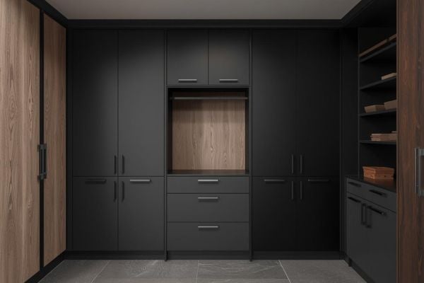 工業風格的系統櫃配色建議以深灰、黑色及深木色為主,搭配金屬質感的裝飾配件與簡潔的櫃體設計,呈現粗獷、硬朗且具現代感的視覺效果。為了避免空間過於壓抑,建議可以搭配適量的淺色木紋飾板以及開放式格櫃或層架,平衡視覺效果並增加收納功能。
