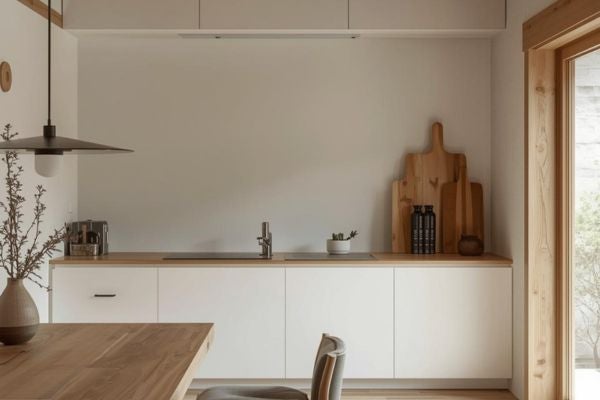 日式侘寂風強調自然、簡約與不完美的美學,營造出簡樸、寧靜且溫暖的居家氛圍。系統櫃顏色建議選用乳白色或淺木色…等柔和的主色調,搭配簡約的線條設計,呈現自然質樸且極簡的設計感,讓空間更具深度與溫暖。