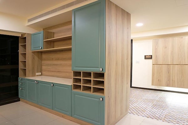 - 小坪數內使用深色系統櫃:小坪數或採光不足的空間中,選擇深色或飽和度高的系統櫃顏色,會使空間顯得更加狹窄與壓迫,建議選用飽和度較低的顏色或增加淺色的跳色設計
