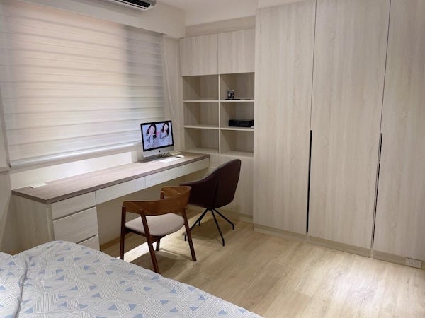 - 臥室:以米灰色與淺木色系統櫃打造柔和且舒眠的氛圍,營造安靜舒適的休憩空間