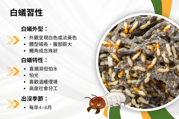 白蟻又稱大水螞蟻、飛蟻,是一種極具破壞力的社會性昆蟲。白蟻種類繁多,在台灣以乾木白蟻、黑翅土白蟻和台灣家白蟻…等品種為主,其中台灣家白蟻和格斯特家白蟻是危害建築物的主要品種。