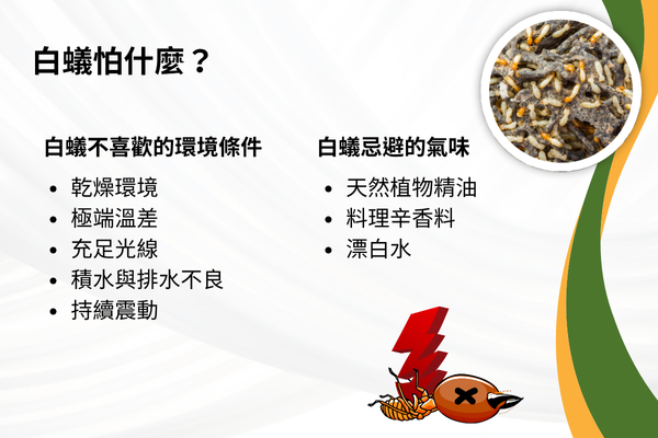 除了了解習性,了解白蟻害怕的氣味與環境也是防治白蟻的重點,以下整理白蟻害怕的項目供您參考: