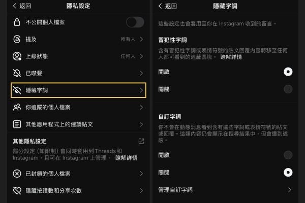 除了可以透過隱藏或噤聲功能限制他人帳號,若某些詞語讓您感到不舒服,也可以透過自訂冒犯性字詞功能過濾這些字詞。
