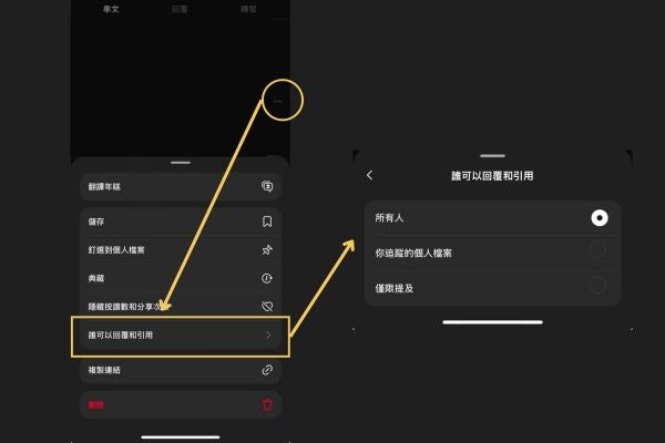 若您希望限制串文的能見對象,發文時可以點選功能選單,限制可以回覆和引用貼文的對象;若您想要設定已發文的串文回覆和引用限制,也可以點擊已建立的串文右上角,透過功能選單中的「誰可以回覆和引用」功能設定。