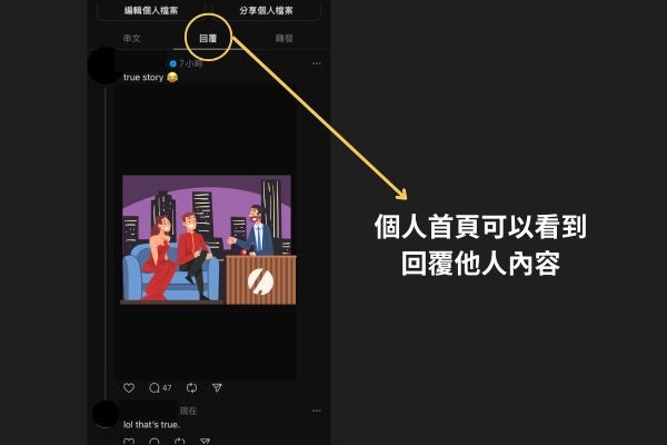 與Facebook或Instagram不同,用戶若在Threads上回覆他人貼文,其他人只要點擊用戶個人頁面中的回覆標籤,就可以看到回覆他人串文的內容。