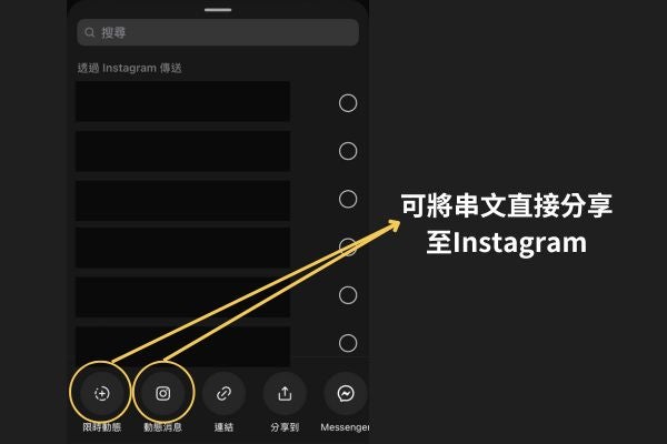 Threads目前是附屬在Instagram下的社交平台,與IG具有較強的連結性,您在Threads發布的串文,可以同步分享到連動的IG帳號限時動態或是動態消息。